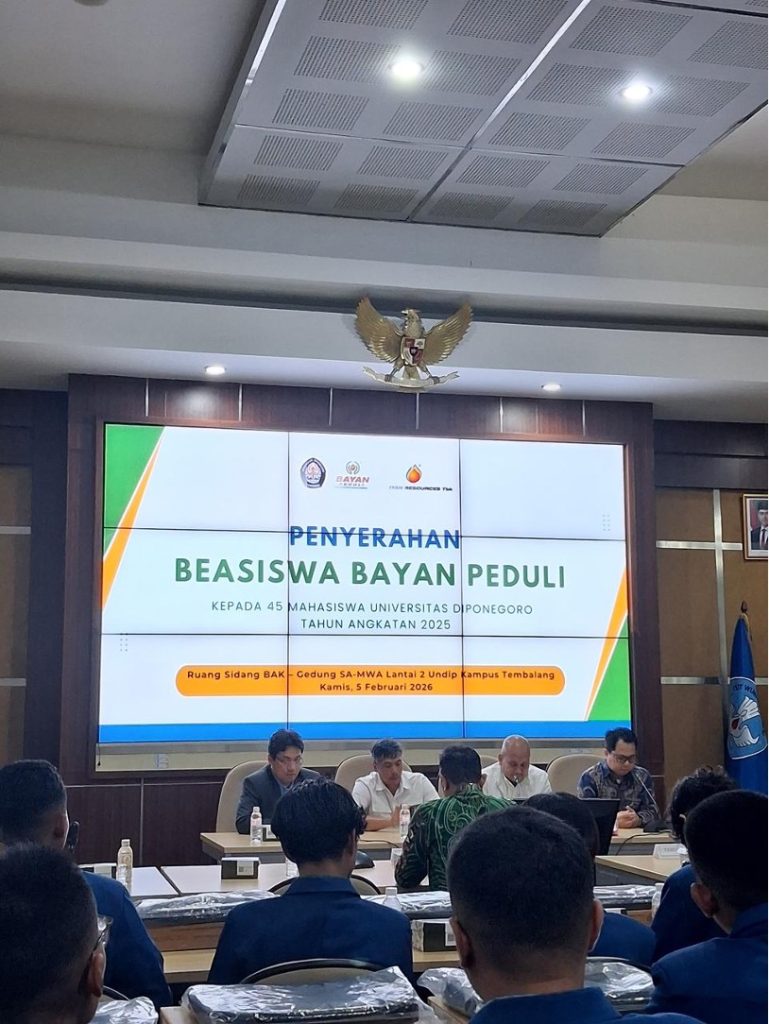 Sebanyak 29 mahasiswa Program Studi Teknologi dan Bisnis Perikanan dan Kelautan (TBPK), Fakultas Perikanan dan Ilmu Kelautan (FPIK), Universitas Diponegoro resmi menerima Beasiswa Bayan Peduli dari PT Bayan Resources dalam seremoni yang berlangsung di Gedung SA-MWA Undip. Program ini menjadi beasiswa kedua yang diberikan kepada mahasiswa TBPK, setelah sebelumnya disalurkan kepada mahasiswa angkatan 2024. Tahun ini, beasiswa diperuntukkan bagi mahasiswa angkatan 2025, menegaskan keberlanjutan komitmen dukungan pendidikan dari PT. Bayan Resources untuk mencetak talenta unggul sektor perikanan dan kelautan.